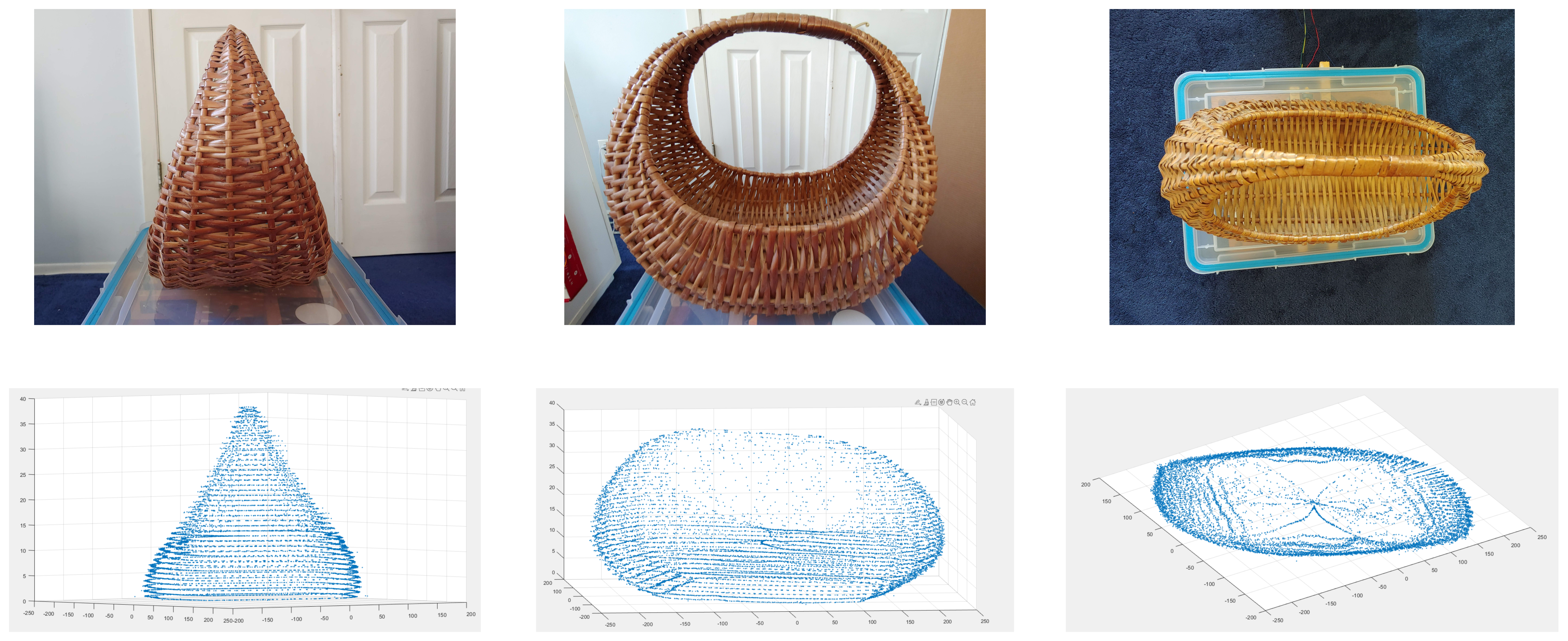 Contour generation was completed by a MATLAB script which read the distance measurement files, parsing out revolution markers. The script interpolated the angular position of each distance reading within a revolution assuming constant angular velocity. After parsing all contours of an object, another script compiled them into a list of coordinates with Z-positions retrieved from the file names. The point cloud was then viewable as a 3D scatter plot.