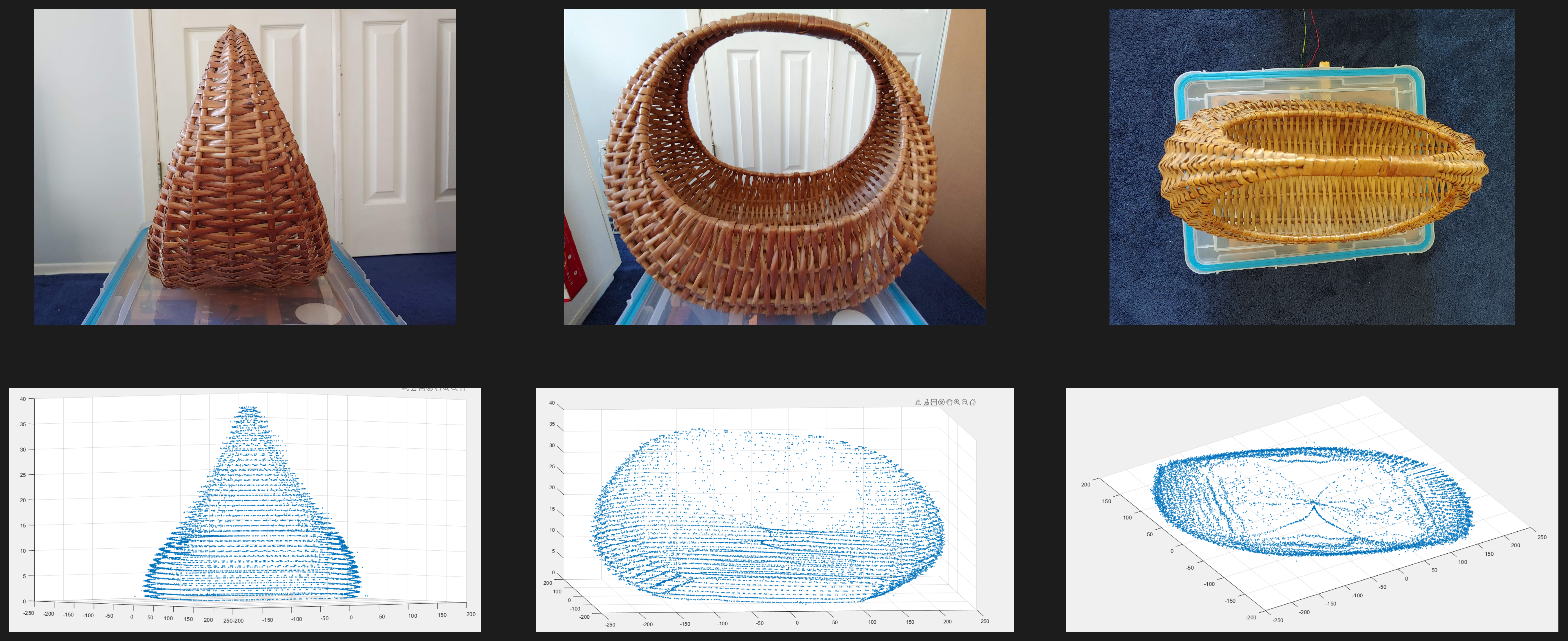 Contour generation was completed by a MATLAB script which read the distance measurement files, parsing out revolution markers. The script interpolated the angular position of each distance reading within a revolution assuming constant angular velocity. After parsing all contours of an object, another script compiled them into a list of coordinates with Z-positions retrieved from the file names. The point cloud was then viewable as a 3D scatter plot.